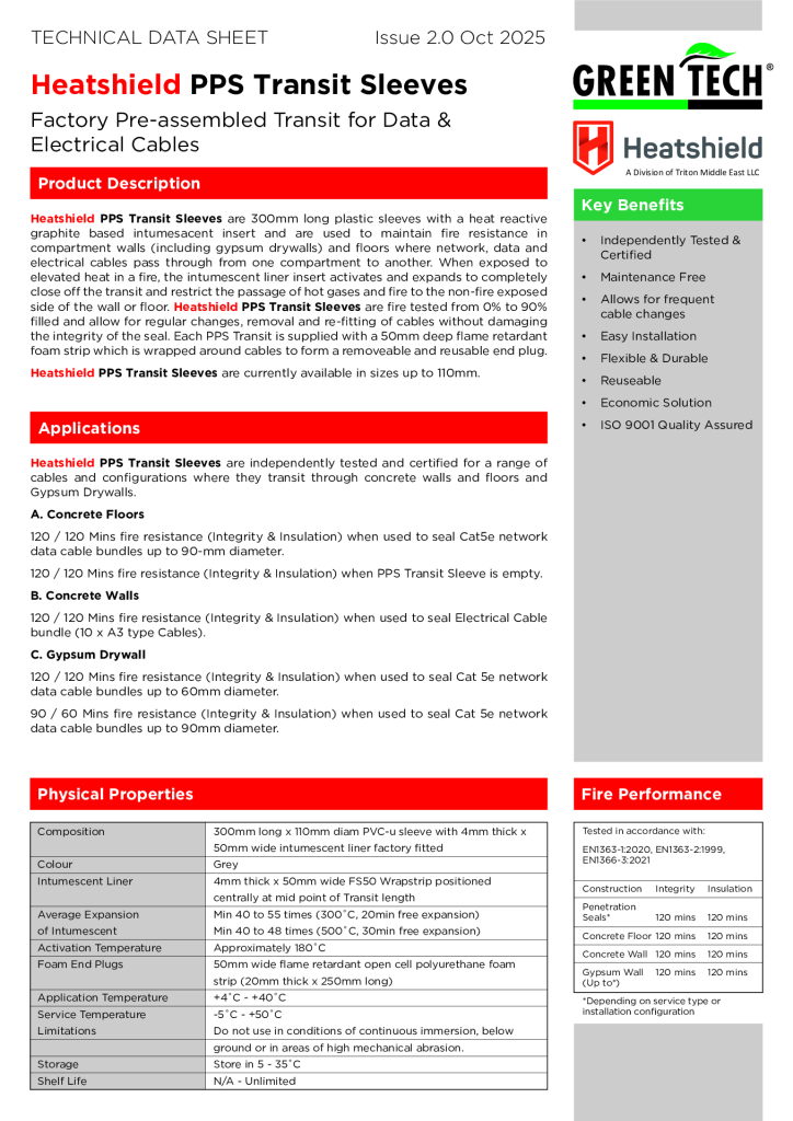 GREENTECH HEATSHIELD PPS Transit Sleeves are designed to restrict the spread of fire and smoke from one compartment to another where network / data cables and electrical cables penetrate through fire rated separating walls and floors, and allow for the removal and re-fitting of cables while maintaining the integrity of the seal.